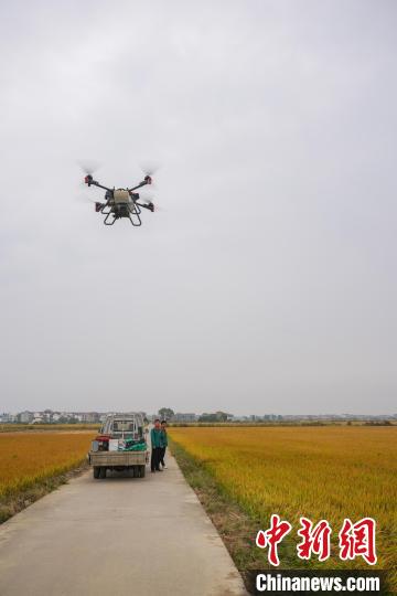 圖為南昌市安義縣農(nóng)戶使用無(wú)人機(jī)在稻田間進(jìn)行油菜籽播種。 記者 華山 攝