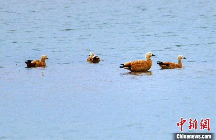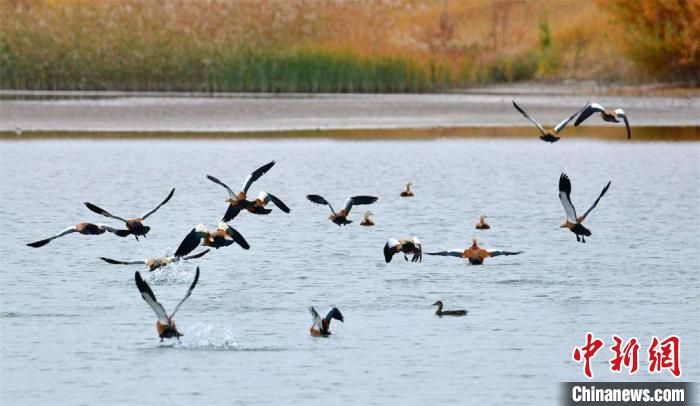 中新網(wǎng)蘭州10月31日電 (記者 馮志軍)“金秋天漸涼,又遇候鳥(niǎo)南飛時(shí)。”近期以來(lái),甘肅酒泉市敦煌鳴沙山下黨河濕地內(nèi),首次出現(xiàn)時(shí)而嬉戲,時(shí)而盤旋起舞的50余只國(guó)家二級(jí)保護(hù)動(dòng)物野生黃鴨,它們悠閑游弋、覓食。作為候鳥(niǎo)遷徙線上不可或缺的“休息站”,這是酒泉市眾多大漠濕地近年“變身”鳥(niǎo)類樂(lè)園的一個(gè)縮影。