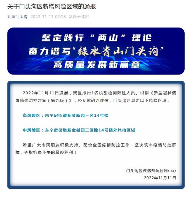 中新網(wǎng)11月11日電 據(jù)“北京門頭溝”微信公眾號消息,北京市門頭溝區(qū)疾病預(yù)防控制中心11日發(fā)布通報稱,2022年11月11日凌晨,門頭溝區(qū)報告1名核酸檢測陽性人員。根據(jù)《新型冠狀病毒肺炎防控方案(第九版)》,經(jīng)專家研判評估,門頭溝區(qū)劃定以下風(fēng)險區(qū)域: