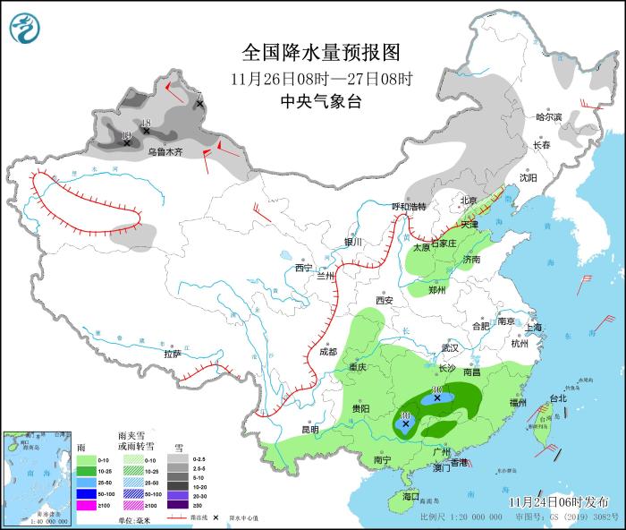 11月24日08時(shí)至25日08時(shí),內(nèi)蒙古東部、東北地區(qū)、新疆沿天山地區(qū)、甘肅河西、川西高原等地部分地區(qū)有小到中雪或雨夾雪,其中,內(nèi)蒙古東北部局地有大雪(5~7毫米)。江南南部、華南大部等地部分地區(qū)有中到大雨,局地暴雨(50~60毫米)。內(nèi)蒙古西部部分地區(qū)有5~7級(jí)風(fēng)(見圖1)。
