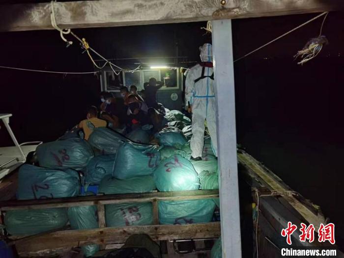 案發(fā)當(dāng)晚22時許,防城港海警局東興第一工作站執(zhí)法員在海域巡邏時,發(fā)現(xiàn)一艘裝有大量袋裝貨物的漁船,形跡可疑。執(zhí)法員隨即向可疑船鳴笛、喊話亮明身份,要求其立即停船接受檢查,執(zhí)法員穿戴好防護裝具后,登臨對船上人員進行控制。