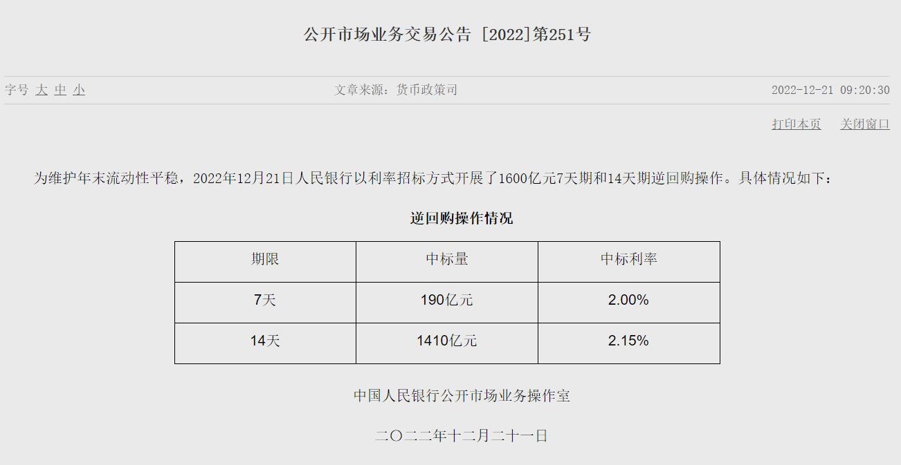 中新網(wǎng)12月21日電 據(jù)央行官網(wǎng)消息,為維護年末流動性平穩(wěn),2022年12月21日人民銀行以利率招標方式開展了1600億元7天期和14天期逆回購操作。中標利率分別為2.00%和2.15%。(中新財經(jīng))