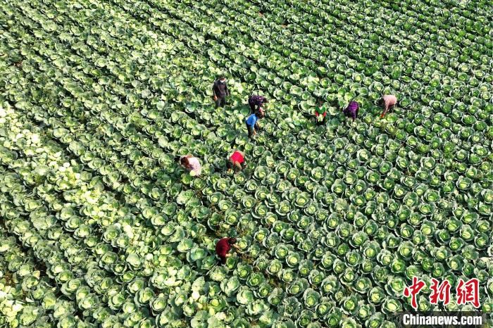 資料圖:村民在收獲甘藍菜。(無人機照片) 郜玉華 攝