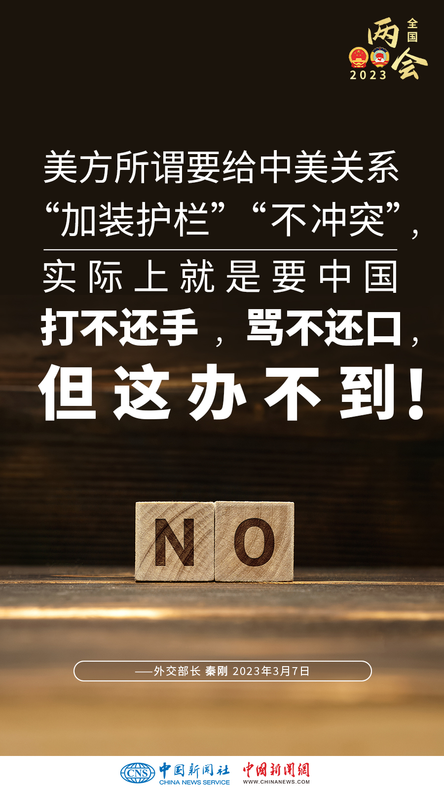 秦剛:美方聲稱要“競贏”中國但不尋求沖突。但實際上,美方的所謂“競爭”,就是全方位遏制打壓,就是你死我活的零和博弈。美方口口聲聲說要遵守規(guī)則,但如同兩位運動員在奧運田徑場上賽跑,一方不是想著如何跑出自己的最好成績,而總是要去絆倒對方,甚至想讓對方參加殘奧會,這不是公平競爭,而是惡意對抗,犯規(guī)了!美方所謂要給中美關(guān)系“加裝護(hù)欄”“不沖突”,實際上就是要中國打不還手,罵不還口,但這辦不到!