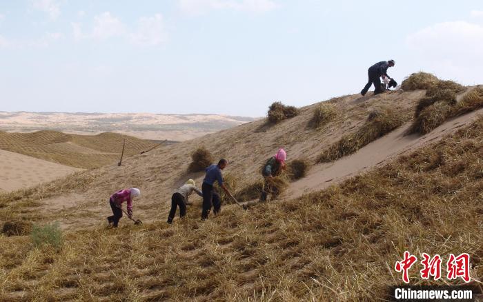 白芨灘林場員工扎麥草方格進行治沙(資料圖)。 寧夏靈武白芨灘國家級自然保護區(qū)管理局供圖