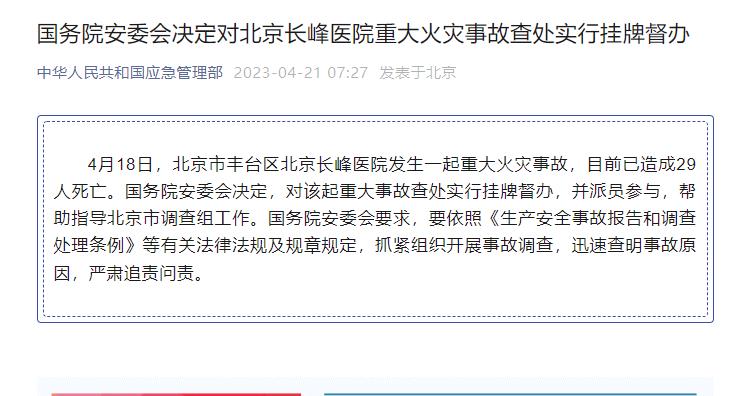 國務院安委會決定對北京長峰醫(yī)院重大火災事故查處實行掛牌督辦