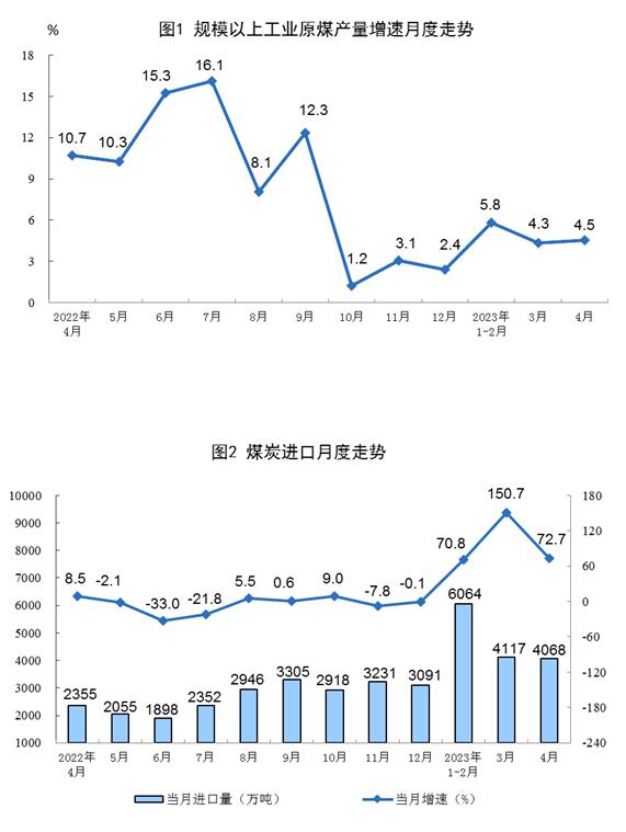 原煤、原油和天然氣生產(chǎn)及相關(guān)情況。原煤生產(chǎn)穩(wěn)步增長(zhǎng),進(jìn)口持續(xù)大幅增加。4月份,生產(chǎn)原煤3.8億噸,同比增長(zhǎng)4.5%,增速比3月份加快0.2個(gè)百分點(diǎn),日均產(chǎn)量1272萬(wàn)噸。進(jìn)口煤炭4068萬(wàn)噸,同比增長(zhǎng)72.7%,增速比3月份回落78.0個(gè)百分點(diǎn)。