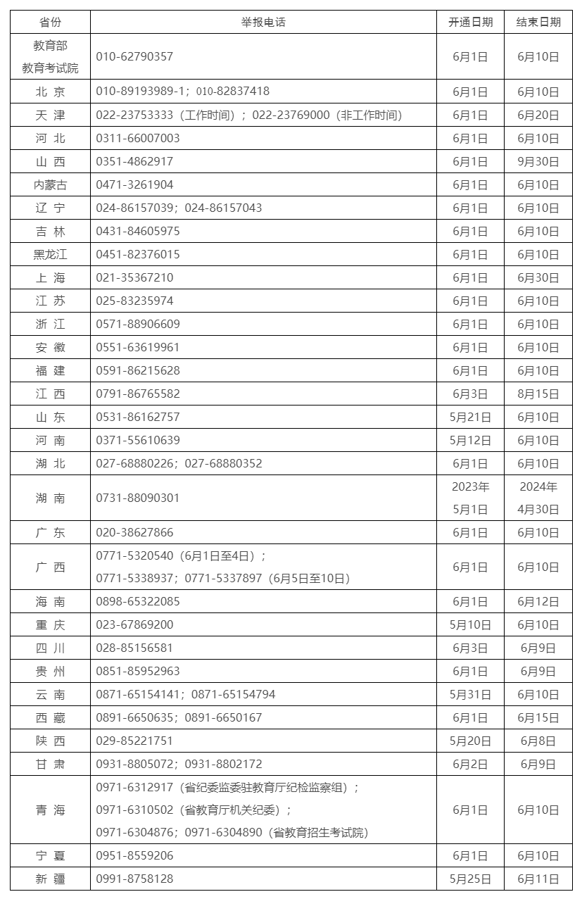 教育部和各?。▍^(qū)、市)開(kāi)通2023年高考舉報(bào)電話(huà)