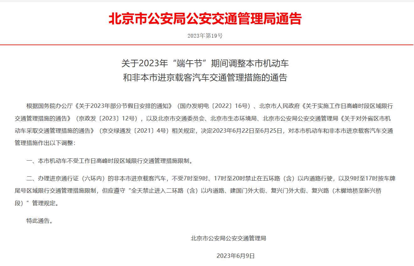 中新網(wǎng)6月14日電 據(jù)北京市公安局公安交通管理局網(wǎng)站消息,北京市公安局公安交通管理局近日發(fā)布通告稱,根據(jù)國務(wù)院辦公廳《關(guān)于2023年部分節(jié)假日安排的通知》(國辦發(fā)明電〔2022〕16號)、北京市人民政府《關(guān)于實施工作日高峰時段區(qū)域限行交通管理措施的通告》(京政發(fā)〔2023〕12號),以及北京市交通委員會、北京市生態(tài)環(huán)境局、北京市公安局公安交通管理局《關(guān)于對外省區(qū)市機(jī)動車采取交通管理措施的通告》(京交綠通發(fā)〔2021〕4號)相關(guān)規(guī)定,決定2023年6月22日至6月25日,對本市機(jī)動車和非本市進(jìn)京載客汽車交通管理措施作出以下調(diào)整: