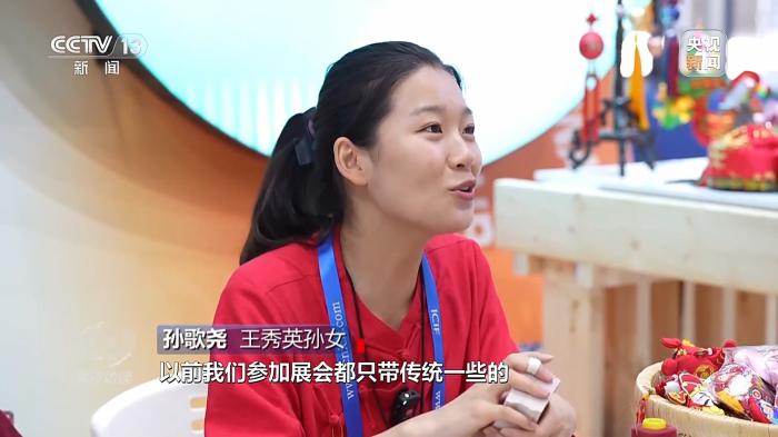 王秀英孫女孫歌堯:第一天人特別多,也有好多參展商們來我這邊參觀想合作,比如給我們一些logo,或者幫他定制一些香包。我們帶動(dòng)馬莊村300多位村民一起做,1天產(chǎn)量能達(dá)到3000個(gè),去年馬莊香包年產(chǎn)值800萬元。