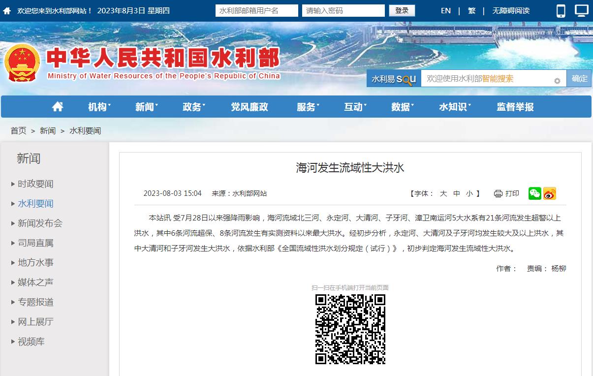 水利部:初步判定海河發(fā)生流域性大洪水