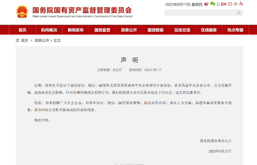 國務(wù)院國資委辦公廳8月17日在國務(wù)院國資委官網(wǎng)發(fā)布聲明稱,近期,持續(xù)有不法分子通過短信、微信、QQ等形式冒用國務(wù)院國資委和中央企業(yè)領(lǐng)導(dǎo)干部身份,甚至偽造中央企業(yè)公章、公文實(shí)施詐騙,造成惡劣社會(huì)影響。針對涉嫌詐騙違法犯罪行為,國務(wù)院國資委將商請公安司法機(jī)關(guān)依法予以打擊,追究其法律責(zé)任。