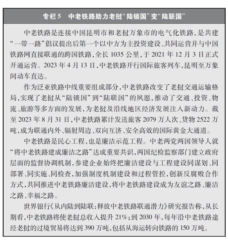 經(jīng)濟走廊和國際通道建設(shè)卓有成效。共建國家共同推進國際骨干通道建設(shè),打造連接亞洲各次區(qū)域以及亞歐非之間的基礎(chǔ)設(shè)施網(wǎng)絡(luò)。中巴經(jīng)濟走廊方向,重點項目穩(wěn)步推進,白沙瓦-卡拉奇高速公路(蘇庫爾至木爾坦段)、喀喇昆侖公路二期(赫韋利揚-塔科特段)、拉合爾軌道交通橙線項目竣工通車,薩希瓦爾、卡西姆港、塔爾、胡布等電站保持安全穩(wěn)定運營,默拉直流輸電項目投入商業(yè)運營,卡洛特水電站并網(wǎng)發(fā)電,拉沙卡伊特別經(jīng)濟區(qū)進入全面建設(shè)階段。新亞歐大陸橋經(jīng)濟走廊方向,匈塞鐵路塞爾維亞貝爾格萊德-諾維薩德段于2022年3月開通運營,匈牙利布達佩斯-克萊比奧段啟動軌道鋪設(shè)工作;克羅地亞佩列沙茨跨海大橋迎來通車一周年;雙西公路全線貫通;黑山南北高速公路順利建成并投入運營。中國-中南半島經(jīng)濟走廊方向,中老鐵路全線建成通車且運營成效良好,黃金運輸通道作用日益彰顯;作為中印尼共建“一帶一路”的旗艦項目,時速350公里的雅萬高鐵開通運行;中泰鐵路一期(曼谷-呵叻)簽署線上工程合同,土建工程已開工11個標(biāo)段(其中1個標(biāo)段已完工)。中蒙俄經(jīng)濟走廊方向,中俄黑河公路橋、同江鐵路橋通車運營,中俄東線天然氣管道正式通氣,中蒙俄中線鐵路升級改造和發(fā)展可行性研究正式啟動。中國-中亞-西亞經(jīng)濟走廊方向,中吉烏公路運輸線路實現(xiàn)常態(tài)化運行,中國-中亞天然氣管道運行穩(wěn)定,哈薩克斯坦北哈州糧油專線與中歐班列并網(wǎng)運行。孟中印緬經(jīng)濟走廊方向,中緬原油和天然氣管道建成投產(chǎn),中緬鐵路木姐-曼德勒鐵路完成可行性研究,曼德勒-皎漂鐵路啟動可行性研究,中孟友誼大橋、多哈扎里至科克斯巴扎爾鐵路等項目建設(shè)取得積極進展。在非洲,蒙內(nèi)鐵路、亞吉鐵路等先后通車運營,成為拉動?xùn)|非乃至整個非洲國家縱深發(fā)展的重要通道。