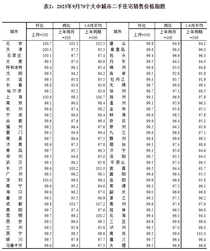 從同比看,9月份,一線城市新建商品住宅銷售價格同比上漲0.7%,漲幅比上月擴大0.1個百分點,其中北京和上海同比分別上漲2.9%和4.4%,廣州和深圳同比分別下降1.7%和3.0%。一線城市二手住宅銷售價格同比下降1.4%,降幅比上月收窄0.2個百分點,其中北京同比上漲1.1%,上海、廣州和深圳同比分別下降1.9%、3.8%和1.0%。