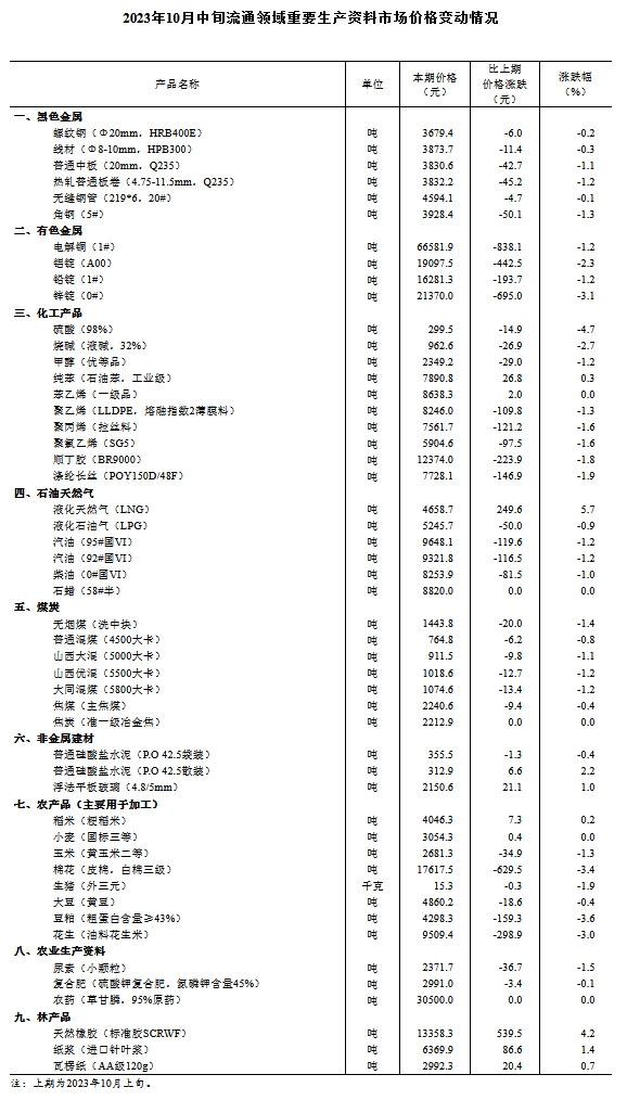 中新網(wǎng)10月24日電 國家統(tǒng)計局網(wǎng)站發(fā)布2023年10月中旬流通領(lǐng)域重要生產(chǎn)資料市場價格變動情況。2023年10月中旬與10月上旬相比,8種產(chǎn)品價格上漲,37種下降,5種持平。其中液化天然氣(LNG)價格環(huán)比漲5.7%,天然橡膠(標(biāo)準(zhǔn)膠SCRWF)價格環(huán)比漲4.2%,棉花價格環(huán)比跌3.4%,生豬(外三元)價格環(huán)比跌1.9%。(中新財經(jīng))