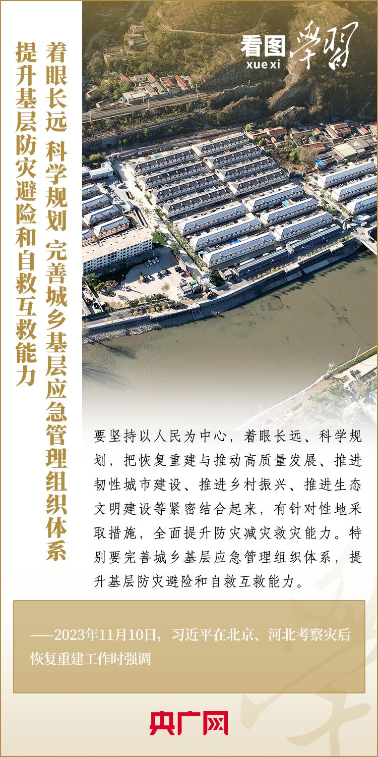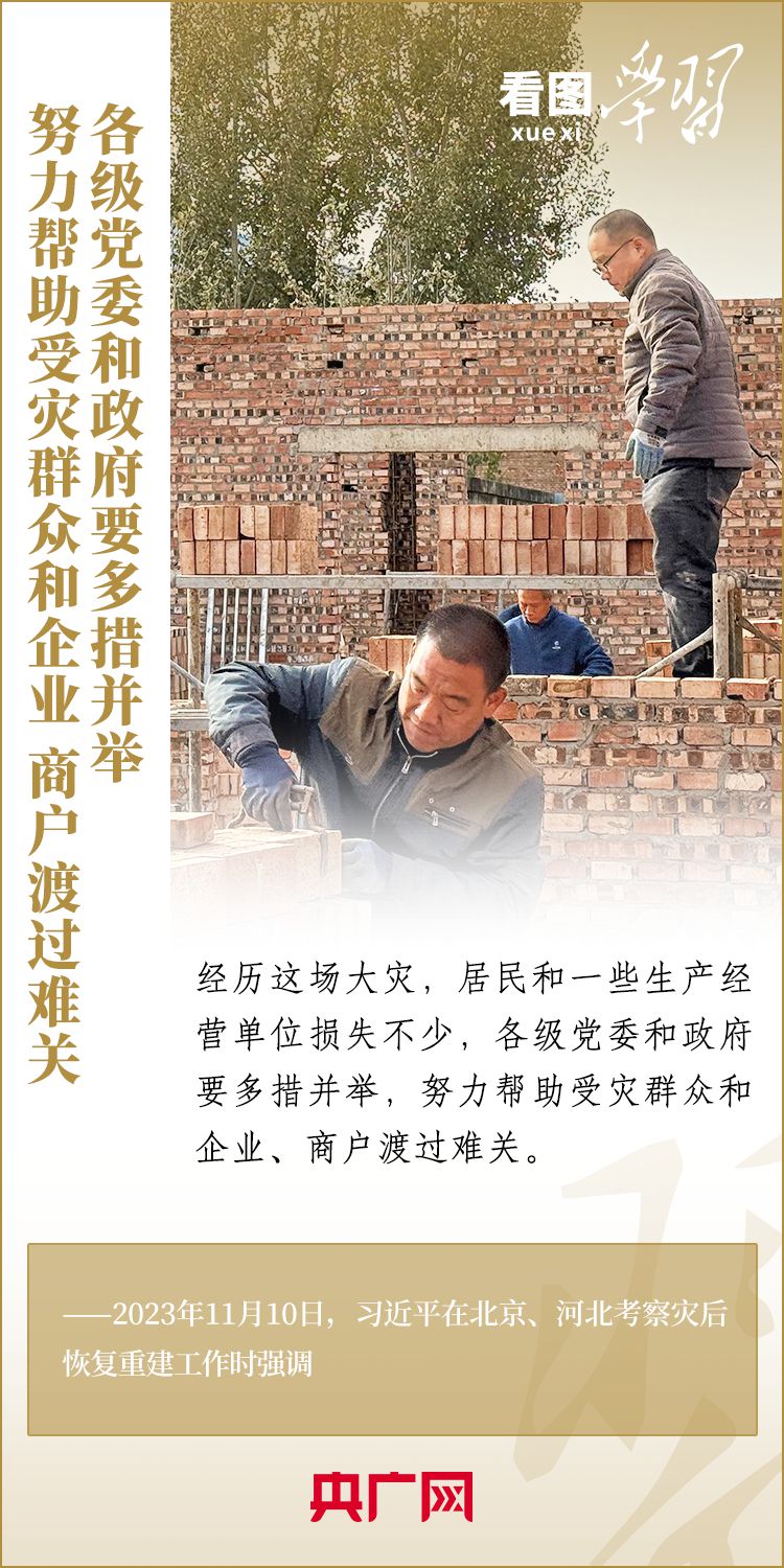 11月10日,習(xí)近平總書記在北京、河北考察災(zāi)后恢復(fù)重建工作。總書記深入學(xué)校、社區(qū)、村莊、水利工程工地,實地察看村容村貌,了解基礎(chǔ)設(shè)施恢復(fù)建設(shè)提升等情況,要求有關(guān)部門堅持以人民為中心,堅持系統(tǒng)觀念,著眼長遠、科學(xué)規(guī)劃,把恢復(fù)重建與推動高質(zhì)量發(fā)展、推進韌性城市建設(shè)、推進鄉(xiāng)村振興、推進生態(tài)文明建設(shè)等緊密結(jié)合起來,有針對性地采取措施,再接再厲抓好災(zāi)后恢復(fù)重建,確保廣大人民群眾安居樂業(yè)、溫暖過冬。