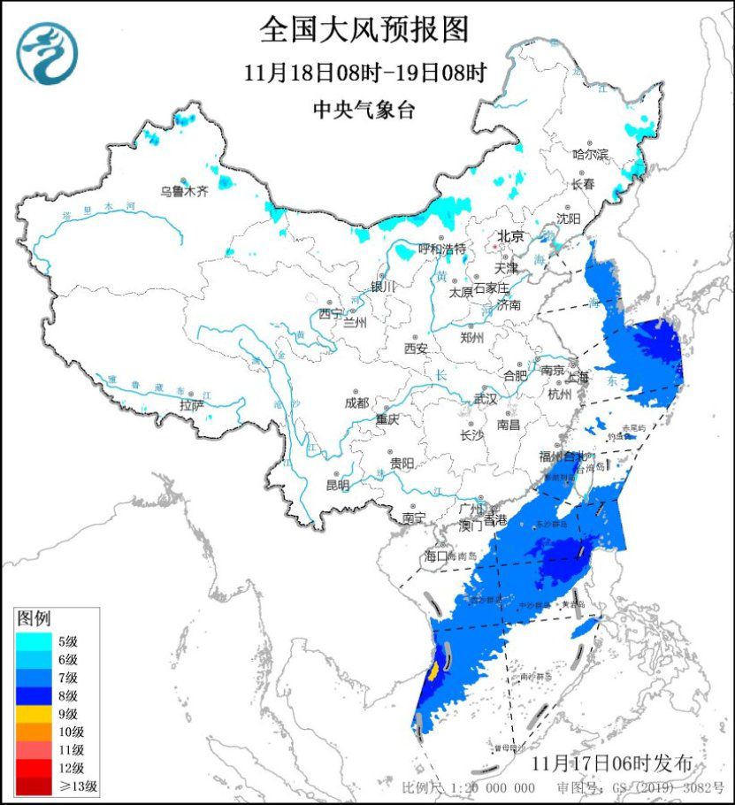 11月17日08時至18日08時,內(nèi)蒙古中東部、東北大部、河北北部、山東半島東部等地將有5~6級、陣風7~8級的大風;渤海、渤海海峽、黃海大部海域、東海大部海域、臺灣海峽、臺灣以東洋面、巴士海峽、南海大部海域?qū)⒂?~8級、陣風9~10級的大風。11月18日08時至19日08時,內(nèi)蒙古中東部、黑龍江東部、吉林東部等地將有5~6級、陣風7~8級的大風;黃海東部海域、東海東北部海域、臺灣海峽、臺灣以東洋面偏南海域、巴士海峽、南海大部海域?qū)⒂?~8級、陣風9~10級的大風。中央氣象臺11月17日06時繼續(xù)發(fā)布大風藍色預(yù)警。