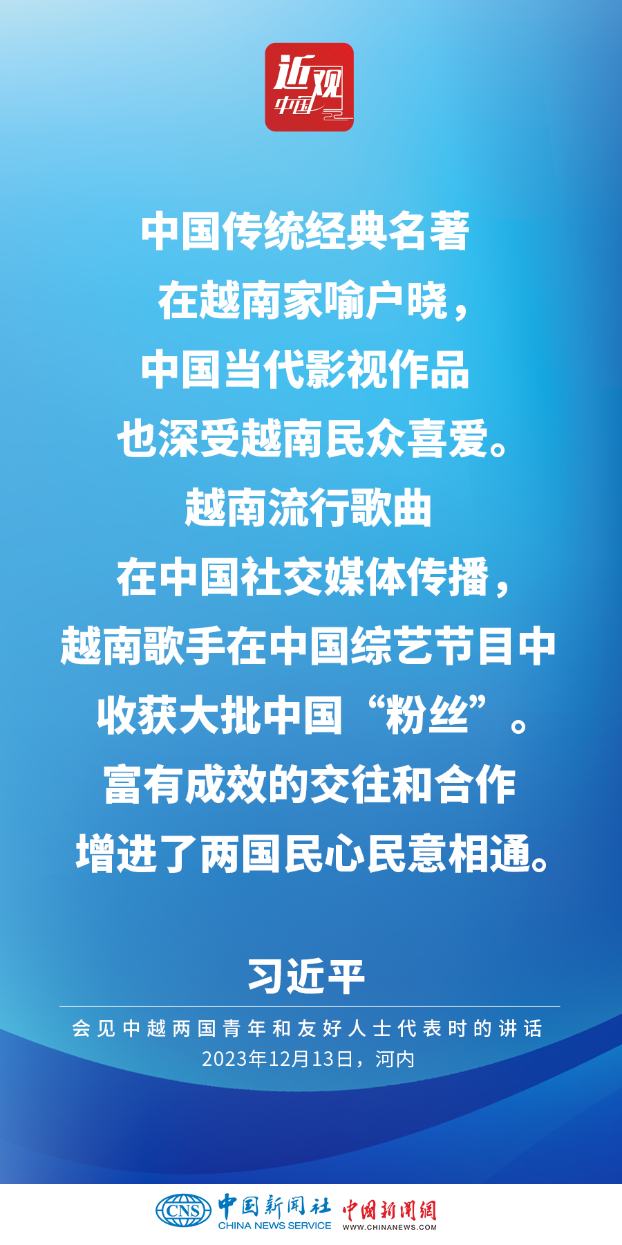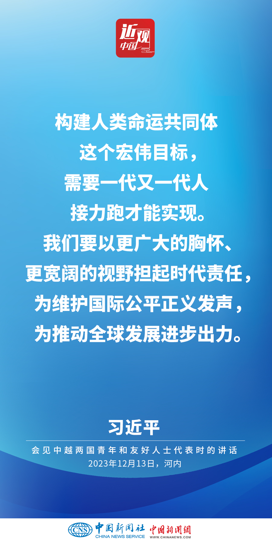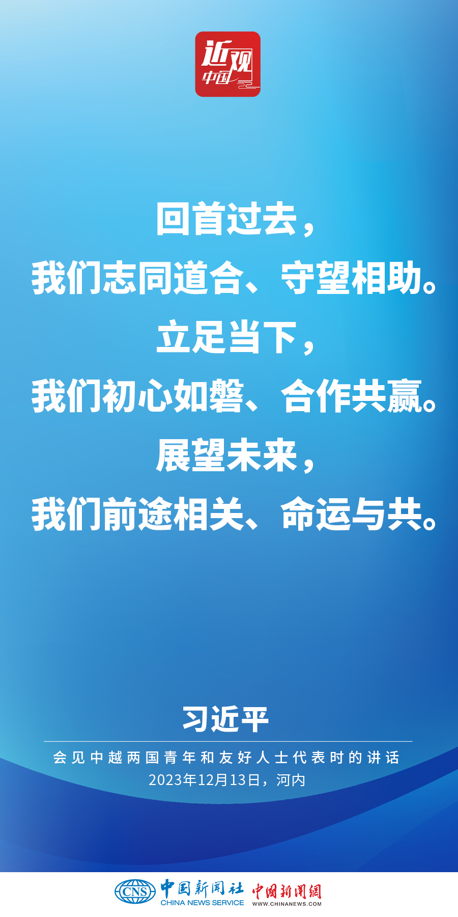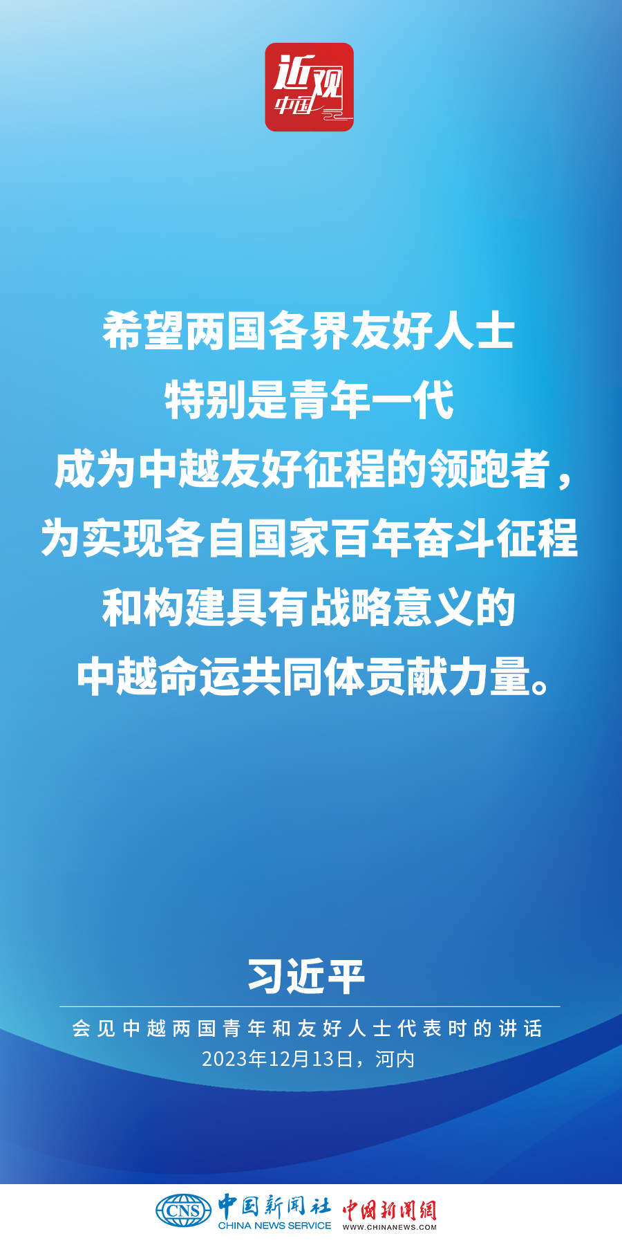 當?shù)貢r間12月13日下午,中共中央總書記、國家主席習近平和夫人彭麗媛在河內(nèi)同越共中央總書記阮富仲夫婦共同會見中越兩國青年和友好人士代表。他在題為《賡續(xù)傳統(tǒng)友誼,開創(chuàng)中越命運共同體建設(shè)新征程》的重要講話中指出,展望未來,我們要始終不忘初心,牢記使命,攜手走好各自社會主義道路,讓工業(yè)化現(xiàn)代化建設(shè)成果更多惠及兩國人民,共同為人類進步事業(yè)作出更大貢獻。