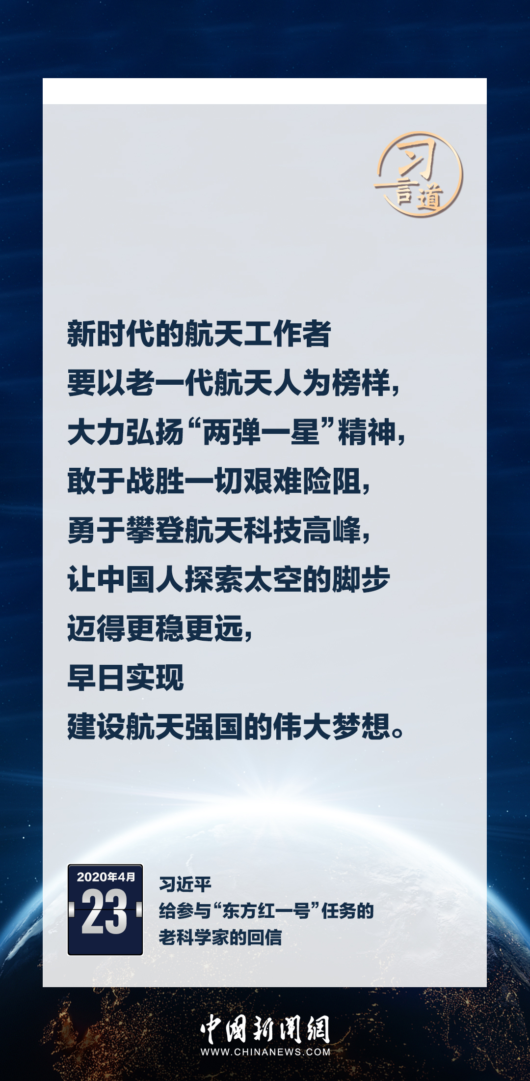 建設(shè)航天強國要靠一代代人接續(xù)奮斗。在不同場合,習(xí)近平總書記頻頻提及航天精神,激勵一代代中國人不斷奮進、筑夢太空。