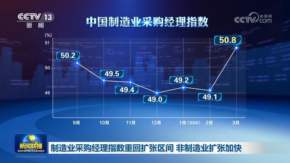 央視網(wǎng)消息:3月31日,《新聞聯(lián)播》報道了3月份中國采購經(jīng)理指數(shù)、各地重大工程建設(shè),以及生態(tài)保護、春耕等領(lǐng)域取得的新成績、新成果,各行各業(yè)奮力拼搏,匯聚成向上的蓬勃力量,繪就出中國經(jīng)濟萬千氣象。