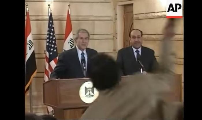 2008年12月,時(shí)任美國(guó)總統(tǒng)小布什在伊拉克首都巴格達(dá)的新聞發(fā)布會(huì)上,被伊拉克記者蒙塔達(dá)爾·扎伊迪扔鞋。圖片來(lái)源:美聯(lián)社視頻截圖