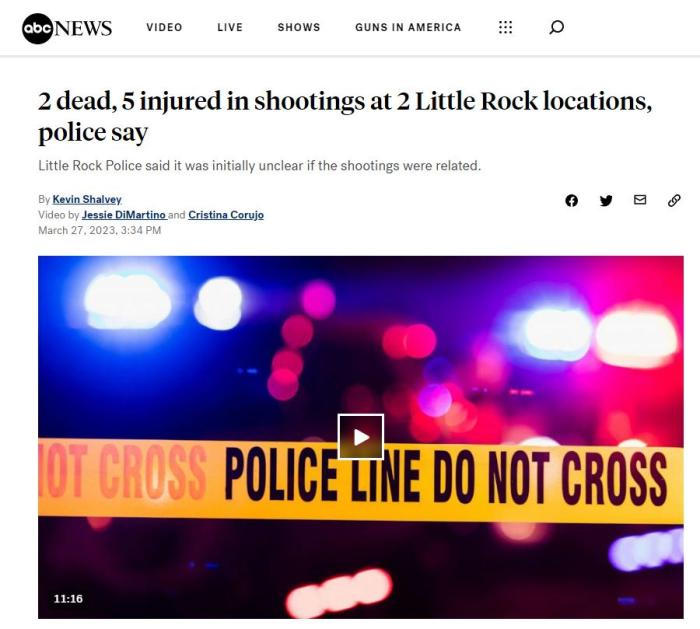 中新網(wǎng)3月27日電 據(jù)美國廣播公司(ABC)報道,當?shù)貢r間26日晚,阿肯色州小石城發(fā)生兩起槍擊事件,造成2人死亡,5人受傷。據(jù)美國“槍支暴力檔案”網(wǎng)站27日發(fā)布的最新數(shù)據(jù)顯示,截至目前,美國2023年因槍死亡人數(shù)已接近10000人。