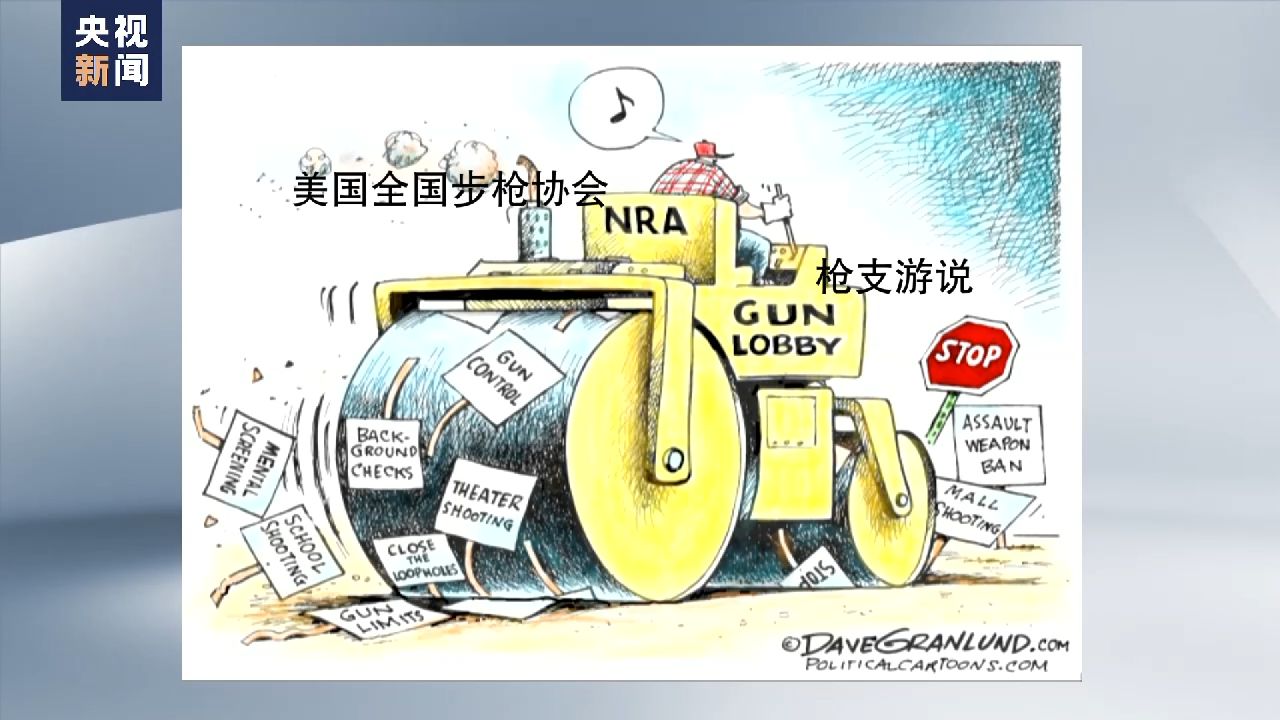 在這幅漫畫中,一名男子聽著音樂,漫不經(jīng)心地開著一輛寫有“美國全國步槍協(xié)會”、“槍支游說”字樣的壓路機一路向前,撞倒了前方赫然在目的“停止”標志。在他身后,“攻擊性武器禁令”、“控槍”、“背景調(diào)查”等標志被一一碾壓,接二連三發(fā)生的“校園槍擊”、“劇院槍擊”、“商場槍擊”等慘痛事件也完全被無視。
