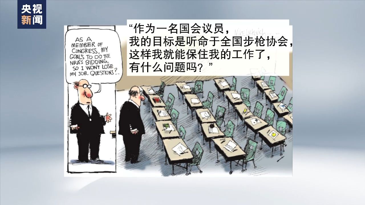 在另一幅漫畫中,在一間寫有“紐敦市一年級”的教室里,擺放著二十張課桌椅,卻唯獨不見孩子的蹤影。漫畫左側(cè),這名來探視的議員心里想的是,“作為一名國會議員,我的目標是聽命于全國步槍協(xié)會,這樣我就能保住我的工作了,有什么問題嗎?”