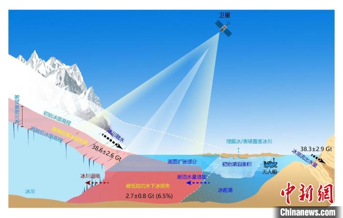 在全球變暖背景下,冰川正在加速消融與退縮。喜馬拉雅地區(qū)分布著數(shù)以萬計冰湖,與冰川相連的冰前湖迅速擴張,約占該區(qū)域冰湖總數(shù)量的12%。此前研究更多聚焦于冰湖面積和水量變化,以及由此引發(fā)的冰湖潰決洪水災害風險。然而,在估算冰川的冰量變化時,傳統(tǒng)的大地測量法未考慮冰湖擴張引起的水下冰質量損失,導致喜馬拉雅地區(qū)甚至全球尺度冰川質量損失被低估。