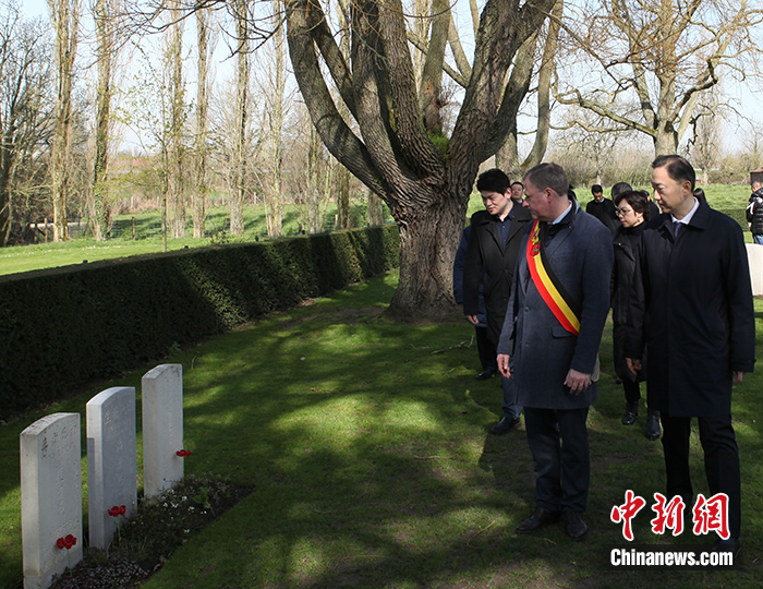 當日,中國駐比利時使館公參吳剛率使館工作人員、中資機構和僑胞代表,與波普林格市市長德雅蓋來到當?shù)氐囊粦?zhàn)華工紀念園,向一戰(zhàn)華工紀念雕像敬獻花環(huán)花束并肅立默哀,其后轉赴波普林格利森托克軍人公墓,祭掃園內一戰(zhàn)華工公墓。