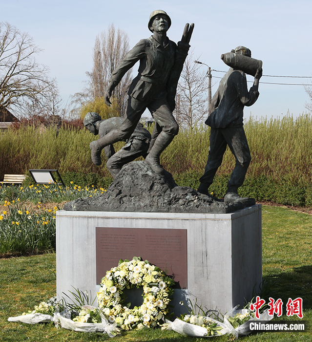 圖為在波普林格一戰(zhàn)華工紀念園,一戰(zhàn)華工紀念雕像前擺放著花環(huán)花束。 中新社記者 德永健 攝