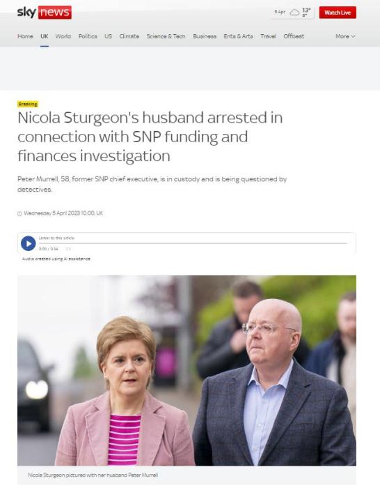 中新網(wǎng)4月5日電 據(jù)英國(guó)廣播公司(BBC)報(bào)道,英國(guó)蘇格蘭政府前首席大臣妮古拉·斯特金的丈夫因與蘇格蘭民族黨財(cái)政調(diào)查有關(guān)而被捕。