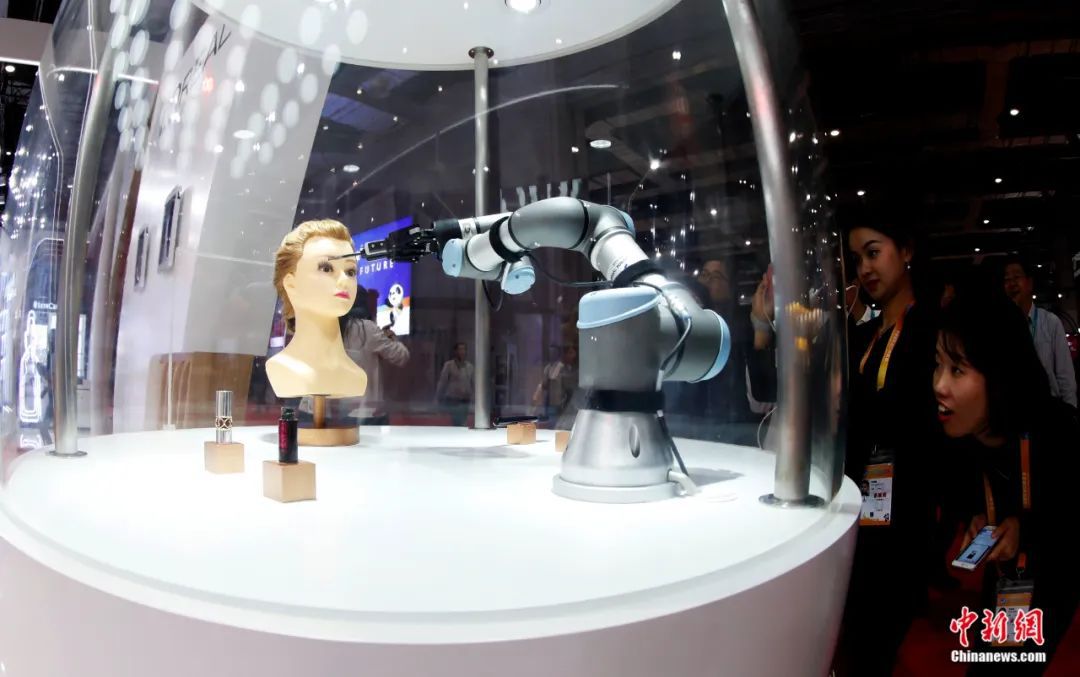 進博會上,展商正在展示機器人化妝技術(shù)。湯彥俊攝