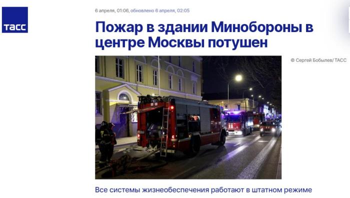 中新網(wǎng)4月6日電 據(jù)塔斯社報道,當?shù)貢r間5日晚間,俄羅斯國防部位于莫斯科茲納門卡大街的一棟辦公大樓內(nèi)出現(xiàn)起火冒煙的情況,目前火勢已被撲滅,沒有人員受傷。