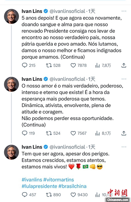巴西名曲《Novo Tempo》在中巴元首會(huì)面時(shí)奏響,歌曲作曲、歌者伊萬(wàn)·林斯在社交媒體上留言。截圖