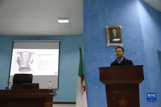 3月7日,在阿爾及利亞塞提夫婦幼醫(yī)院,中國(guó)援阿醫(yī)療隊(duì)醫(yī)生朱濤為當(dāng)?shù)刈≡横t(yī)師、醫(yī)學(xué)院學(xué)生等做講座。新華社發(fā)(中國(guó)援阿醫(yī)療隊(duì)供圖)