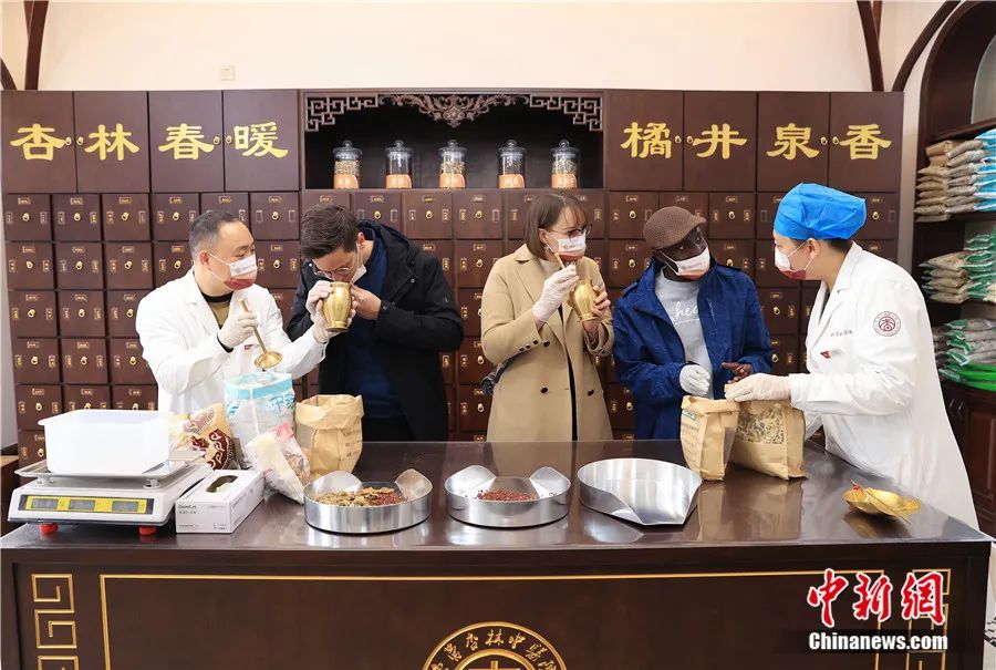 來自比利時(shí)、白俄羅斯和加納的外國友人在山東東營一家中醫(yī)醫(yī)院的中藥房識(shí)別、稱量中藥材。周廣學(xué) 攝