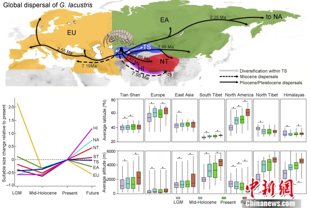 此次野外調(diào)查研究發(fā)現(xiàn),高山湖泊是冷水性鉤蝦全球遷移擴(kuò)展的通道,更新世氣候變冷形成大量高山湖泊或冰川湖,驅(qū)動(dòng)鉤蝦多次從天山拓殖到全球高山湖泊以及環(huán)北寒帶冰川湖泊中,該研究定義這種新的分化方式為“出芽式分化”。研究還發(fā)現(xiàn),未來(lái)氣候變暖將導(dǎo)致鉤蝦局限在更高海拔更高緯度,造成遺傳多樣性降低。