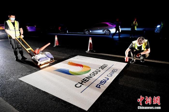 資料圖:圖為成都大運會專用車道地標設立現(xiàn)場。中新社記者 安源 攝