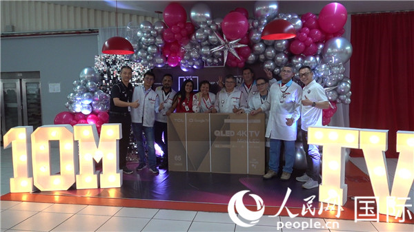 中巴員工利用午飯空閑時(shí)間一起紀(jì)念第1000萬臺電視機(jī)下線。人民網(wǎng)記者吳杰 攝