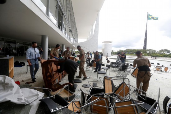 1月9日,在巴西首都巴西利亞,工作人員清理總統(tǒng)府普拉納爾托宮遭到破壞的家具。新華社發(fā)(盧西奧·塔沃拉攝)
