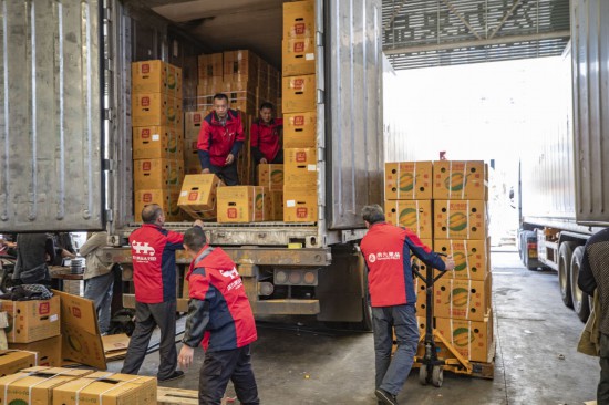 在重慶市江津區(qū)雙福農(nóng)貿(mào)城,洪九果品的工作人員在搬運(yùn)從泰國(guó)運(yùn)輸過(guò)來(lái)的榴蓮(2022年4月19日攝)。新華社記者 黃偉 攝