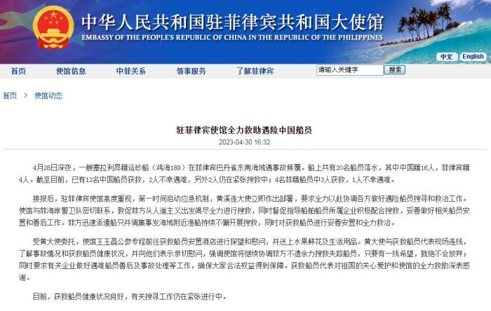 接報(bào)后,駐菲律賓使館高度重視,第一時(shí)間啟動(dòng)應(yīng)急機(jī)制,黃溪連大使立即作出部署,要求全力以赴協(xié)調(diào)各方做好遇險(xiǎn)船員搜尋和救治工作。使館與菲海岸警衛(wèi)隊(duì)密切聯(lián)系,敦促菲方從人道主義出發(fā)竭盡全力進(jìn)行搜救,同時(shí)督促指導(dǎo)船舶船員所屬企業(yè)積極配合搜救,妥善做好相關(guān)船員安置和善后工作。菲方迅速派遣船只并調(diào)集事發(fā)海域附近漁船持續(xù)不懈開展搜救,同時(shí)對(duì)獲救船員進(jìn)行妥善安置和全力救治。