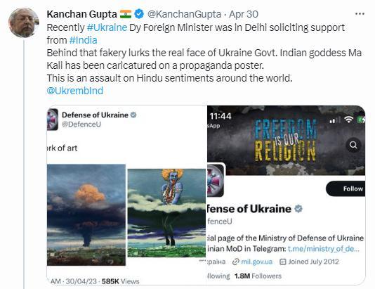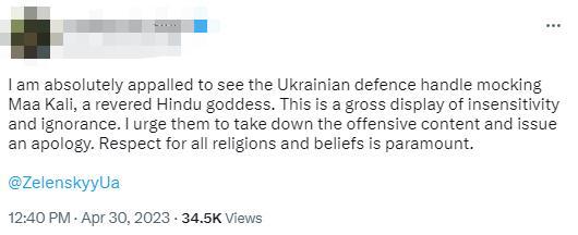 《印度斯坦時(shí)報(bào)》稱(chēng),這張圖被認(rèn)為丑化了印度教女神,是“對(duì)印度教的不尊重”,推文“遭到強(qiáng)烈反對(duì)”“傷害了印度人的感情”。甚至有印度網(wǎng)友呼吁印度官方干預(yù)此事。目前,烏克蘭國(guó)防部已經(jīng)刪除該推文。