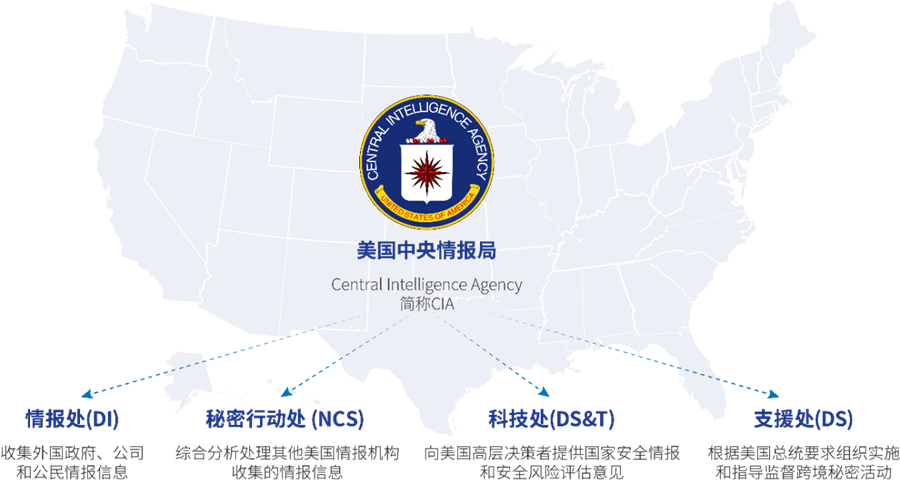 CIA是美國聯(lián)邦政府主要情報(bào)機(jī)構(gòu)之一,總部位于美國弗吉尼亞州蘭利,下設(shè)情報(bào)處(DI)、秘密行動(dòng)處(NCS)、科技處(DS&T)、支援處(DS)四個(gè)部門。其主要業(yè)務(wù)范圍涉及:收集外國政府、公司和公民情報(bào)信息;綜合分析處理其他美國情報(bào)機(jī)構(gòu)收集的情報(bào)信息;向美國高層決策者提供國家安全情報(bào)和安全風(fēng)險(xiǎn)評估意見;根據(jù)美國總統(tǒng)要求組織實(shí)施和指導(dǎo)監(jiān)督跨境秘密活動(dòng)等。