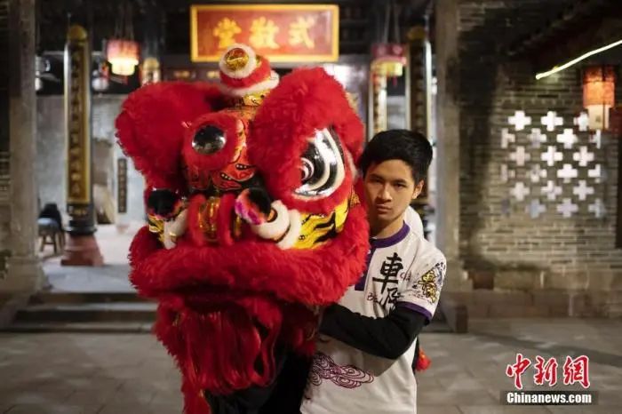 圖為2022年1月18日晚,廣州市天河區(qū)車陂龍獅體育會舞獅隊隊員王智銘在晴川蘇公祠拿著一頭紅獅。王智銘是一名“00后”,學(xué)習(xí)舞獅已3年,他說自己的目標(biāo)是“世界獅王”。 中新社記者 陳楚紅 攝