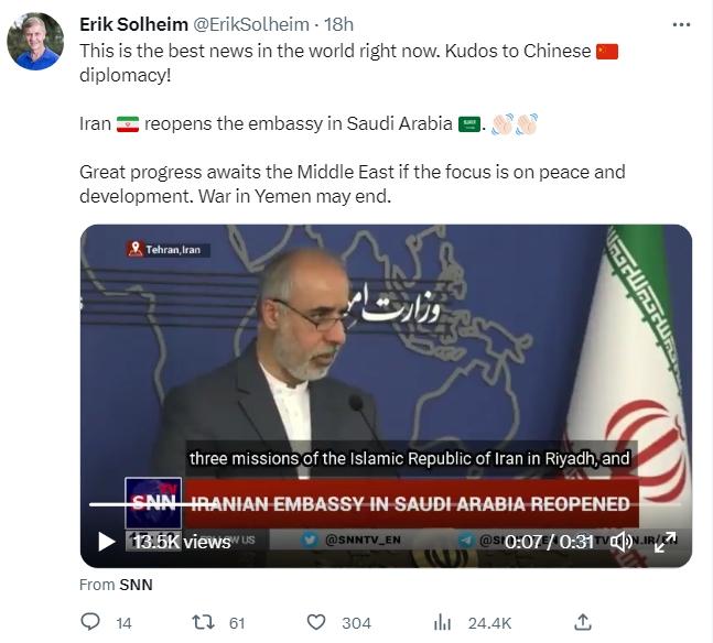 索爾海姆配文提到“伊朗重新開放駐沙特阿拉伯大使館”。他表示,“這是目前世界上最好的消息。為中國外交點(diǎn)贊!”