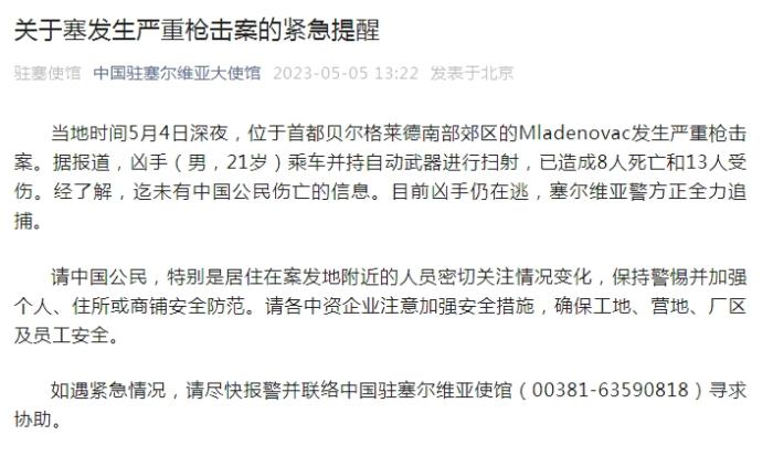 中新網(wǎng)5月5日電 據(jù)中國駐塞爾維亞大使館微信公眾號消息,當?shù)貢r間5月4日深夜,位于首都貝爾格萊德南部郊區(qū)的Mladenovac發(fā)生嚴重槍擊案。據(jù)報道,兇手(男,21歲)乘車并持自動武器進行掃射,已造成8人死亡和13人受傷。經(jīng)了解,迄未有中國公民傷亡的信息。目前兇手仍在逃,塞爾維亞警方正全力追捕。