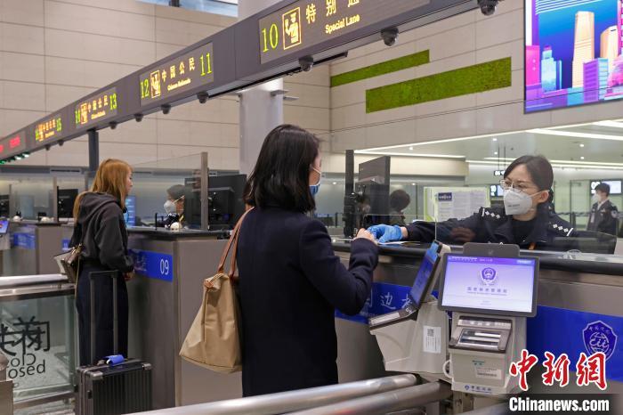 資料圖:虹橋邊檢站民警在對(duì)出境旅客進(jìn)行信息核查?!∫罅⑶?攝