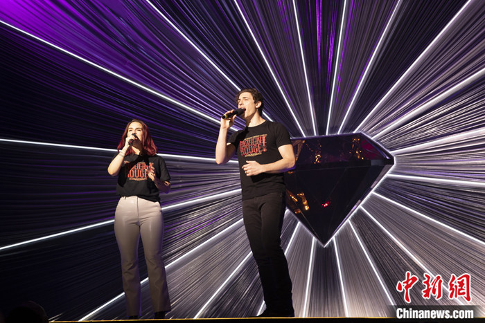 圖為該劇主演德里克·克雷納(Derek Klena)和喬安娜·勒文斯克(Joanna“Jojo” Levesque)為學生們獻唱。 中新社記者 廖攀 攝